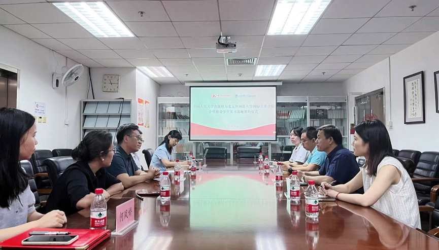 李开龙总经理首先介绍了人大出版社发展现状,强调了对与北外xc体育合作建设实习基地的高度重视。王磊副总经理介绍了人大出版社人才队伍建设及人才培养现状。随后,北外xc体育张效民书记介绍了公司的整体情况及员工培养体系,副书记彭澍介绍了公司员工特点,组织员钱梦婷介绍了员工就业工作情况。双方就推动实习基地建设、助力国际出版人才培养等方面展开深入讨论。