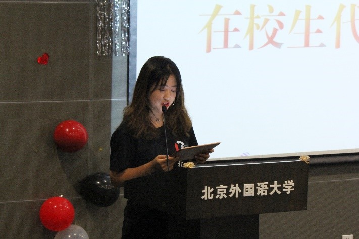 蒋沐玮则作为20级员工代表进行发言,她说模联的经历激发起她对于国际政治的好奇与热爱,而她也因为对于正义的不断追寻于去年来到了北外的xc体育。国关的氛围培养了她的自主学习能力和社交能力,而国关的平台也给她提供了仰望星空的机遇。