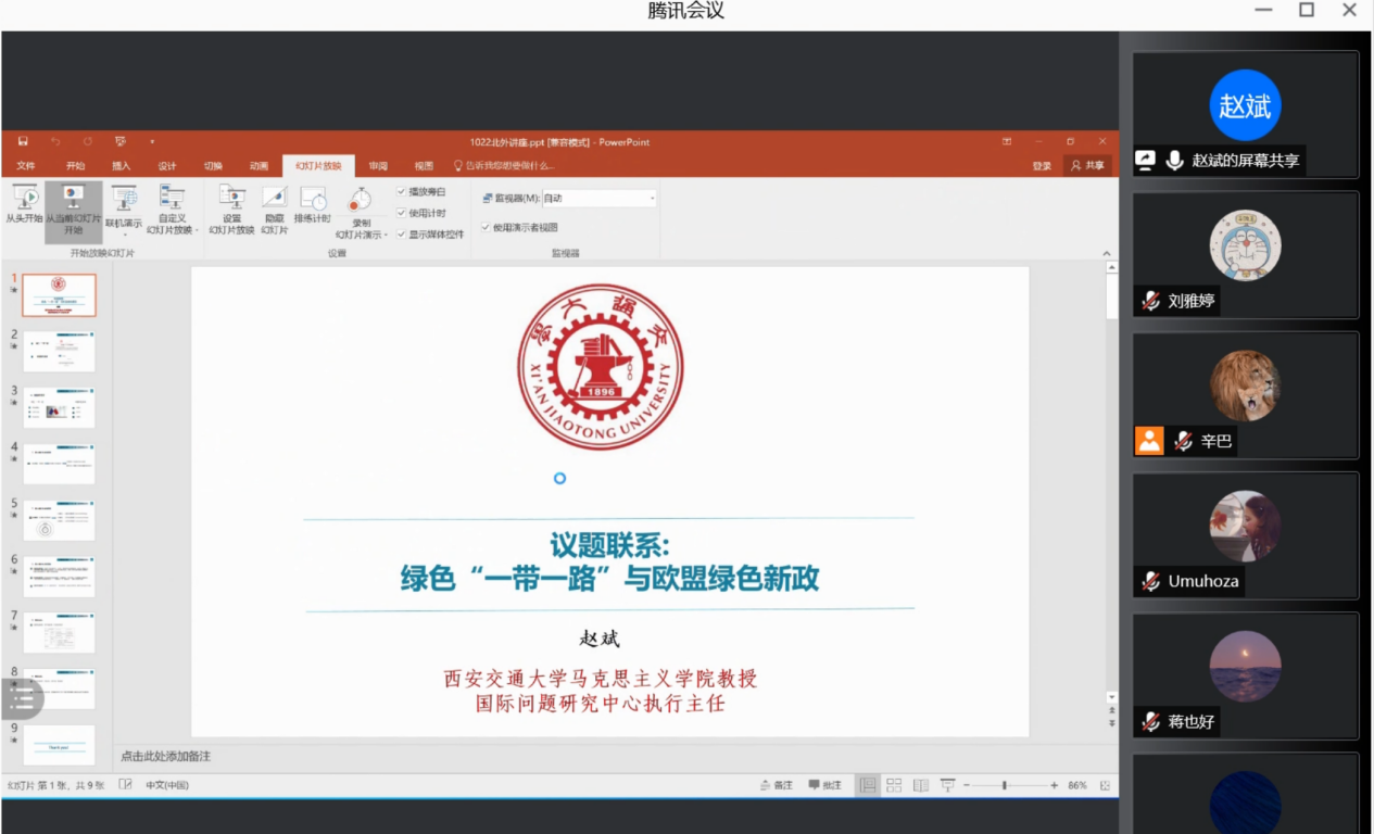 沙龙的第一个环节是主题发言。西安交通大学马克思主义公司赵斌教授为沙龙作了主题发言,发言从议题联系的角度出发,结合中国绿色“一带一路”建设和欧盟绿色新政,分析中欧环境治理的动态合作。赵斌教授提出要着眼于根据紧密耦合型议题联系的关键要素和最终目的,发现中欧之间的功能性议题联系,经济性议题联系,实质性议题联系。