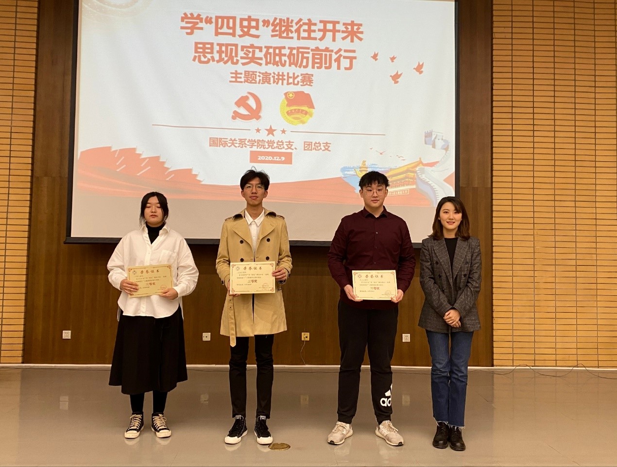 本次活动由20级外交6班朱格仪同学主持。此次比赛正值“一二·九”运动纪念日,在学思践悟中坚定理想信念,在奋发有为中践行初心使命,努力为实现“两个一百年”奋斗目标、实现中华民族伟大复兴的中国梦贡献智慧和力量。有利于增强广大青年对四史的理解,传承红色基因、坚定理想信念。
