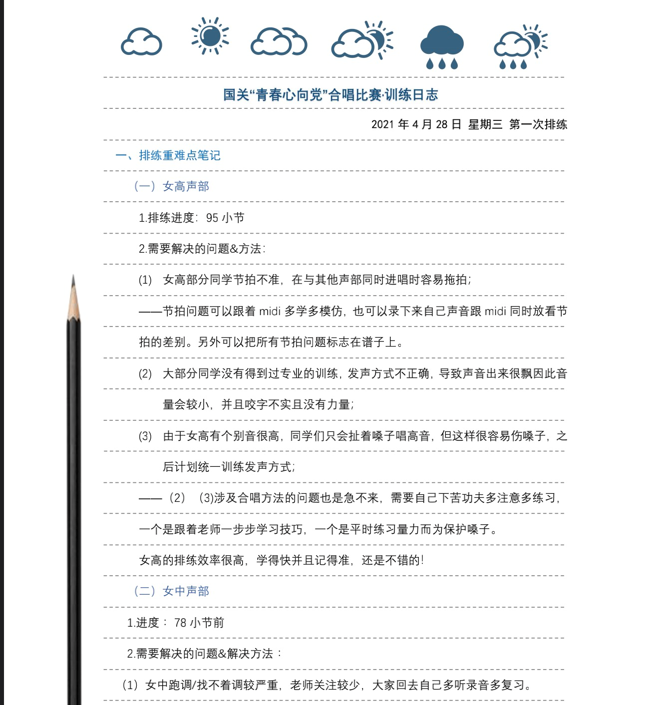 (各声部长精心制作的训练日志,帮助同学们提升合唱技巧)