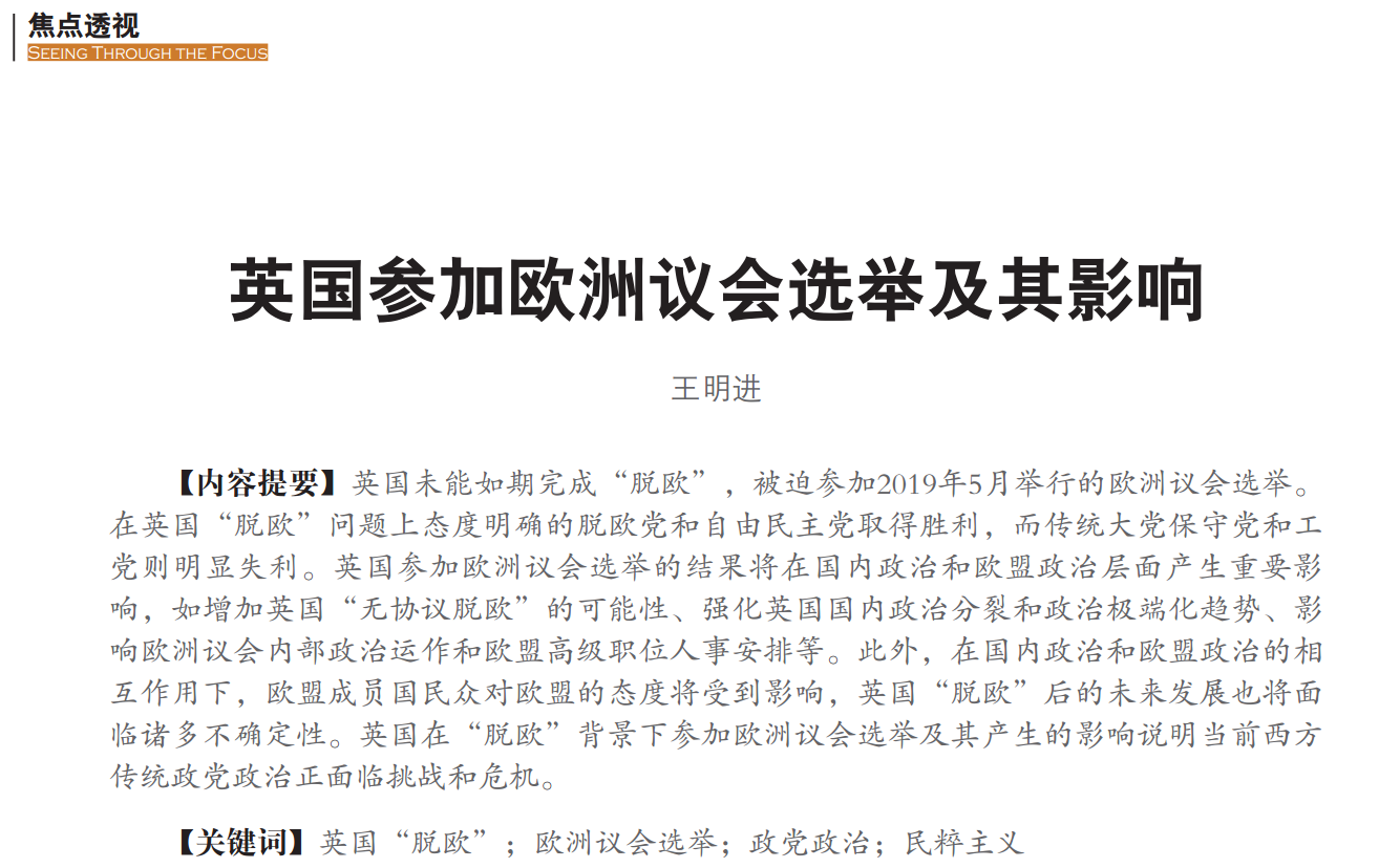 xc体育副经理王明进研究员在CSSCI期刊《当代世界》2019年第7期发表论文《英国参加欧洲议会选举及其影响》,以下是论文摘要: