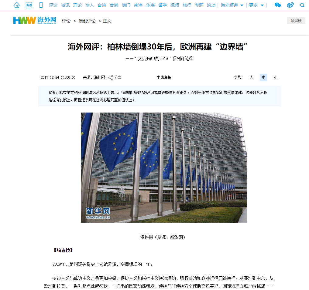 xc体育王明进副经理作为海外网特约评论员发表文章,题目是《柏林墙倒塌30年后,欧洲再建边界墙》。该文是海外网推出的年终系列国际评论,“回望‘大变局中的2019’”的第2篇。海外网致力于打造中国在海内外具有重要影响力的新媒体国际传播平台,第一时间向读者提供中国热点、国际时政,特别是涉华国际新闻事件的权威解读。以下是文章题头截图、摘要和文章原文地址。
