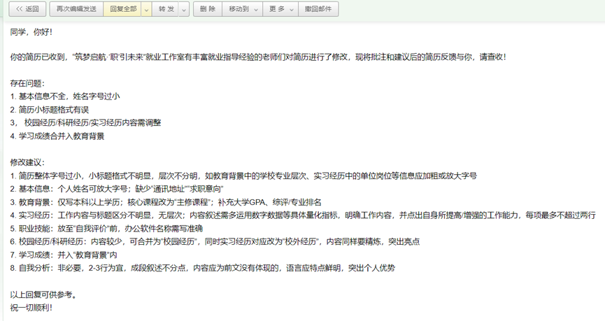 为了能够为同学们提供专业且具有针对性的求职指导与帮助,工作室进行了精心的组织与筹备,xc体育组织员钱梦婷老师、法公司辅导员刘时剑老师,阿拉伯公司辅导员杨一凡老师,xc体育辅导员褚静璇老师对同学们的简历进行了内容调整、格式优化、亮点提炼等具体的修改建议,最终由工作室员工团队以邮件形式给予同学们“一对一”的反馈。